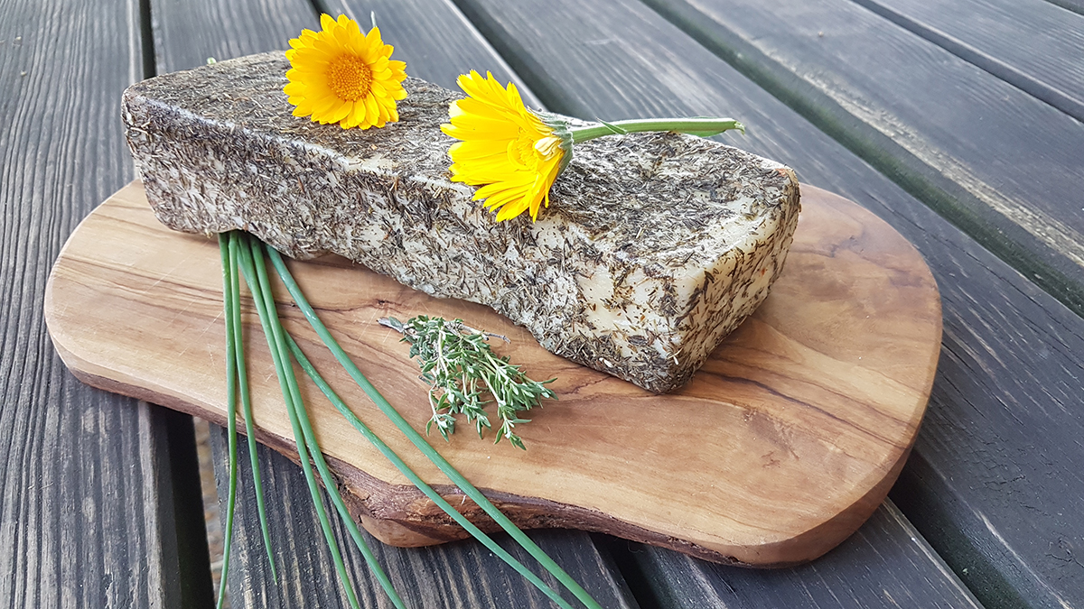 Weißer Rückenspeck (Lardo) mit Kräutern gewürzt, luftgetrocknet. Kompakt und trotzdem auf der Zunge zergehend.
