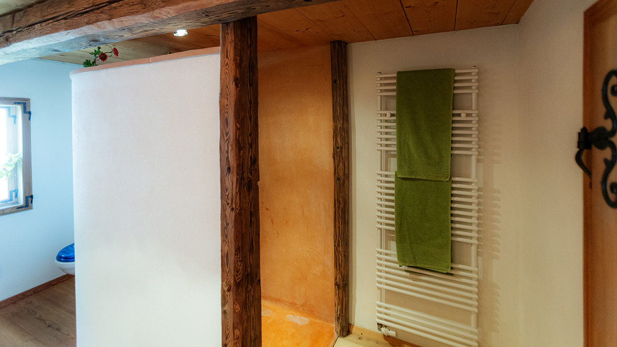 Großes Bad mit Bidet. Dusche in Tadelaktausführung, Dielenboden und Lehmputz auch im Bad.